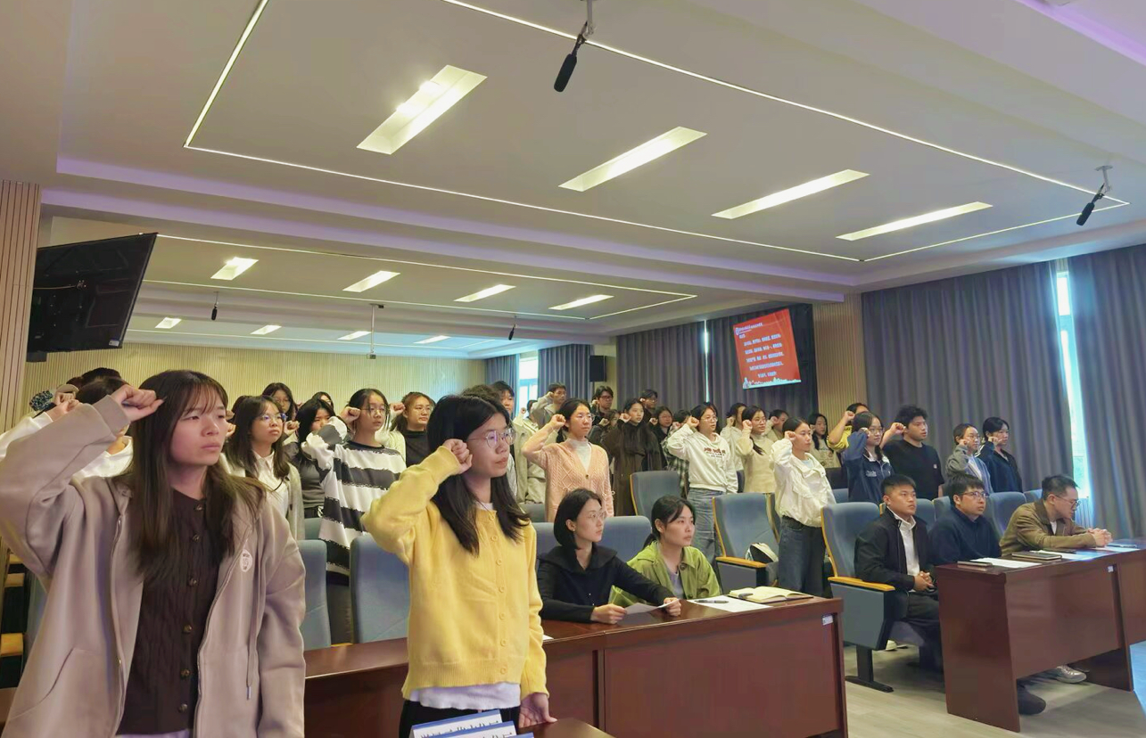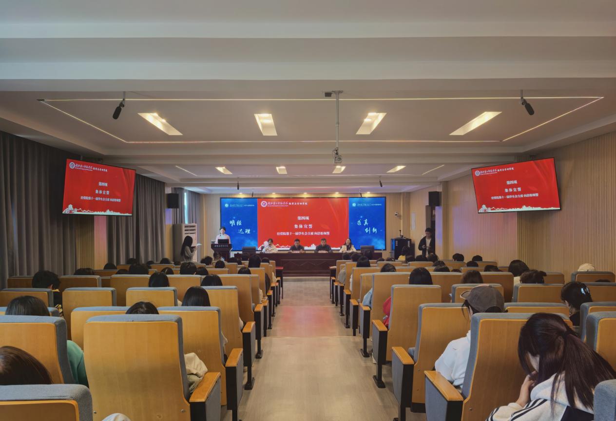 2025级物流管理1班班长秦子玮承诺将带领班级同学积极响应学风建设号召,营造优良班风。她表示学风建设不是口号而是脚踏实地,全体学生共同努力才能建设良好积极的学风。在全体师生的共同见证下,第十一届学生会主席团成员向洁怡带领现场学生集体宣誓,表达了践行优良学风的决心。宣誓环节后,李京为“学风示范座位区”颁发桌牌,他鼓励学生以他们为榜样,推动学院学风建设。