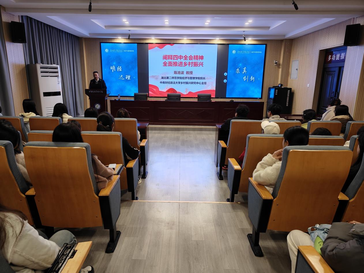 本网讯(通讯员 魏雪晴)为深入学习贯彻党的二十届四中全会精神,引导青年学子深刻把握乡村振兴战略内涵,12月2日晚,学院于2号楼三楼报告厅开展“阐释四中全会精神 全面推进乡村振兴”主题宣讲,入党积极分子和学生党员参加,院长陈池波教授主讲。