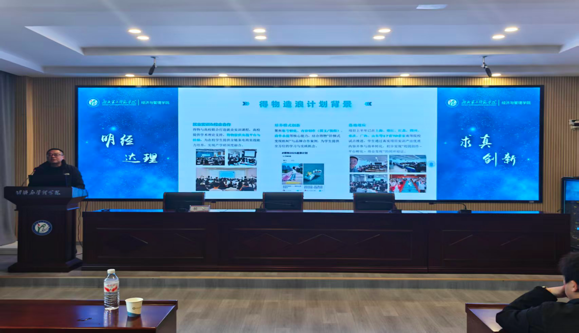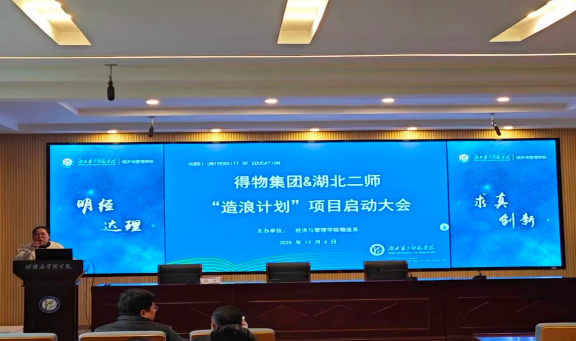本网讯(通讯员 王迪)2025年12月4日,得物集团与经管学院物流系合作的“造浪计划”校企项目启动大会在2号楼三楼多功能报告厅成功举行。此次大会邀请得物集团公共事业部华中大区总监刘江先生出席,并为在场的2023级、2024级物流管理专业全体学生详细解读了“造浪计划”课程体系与培养愿景。此次大会标志着双方在深化产教融合、共育行业新人才方面迈出了坚实一步,旨在为物流管理专业学子搭建直面行业前沿、连接理论实践的优质平台。