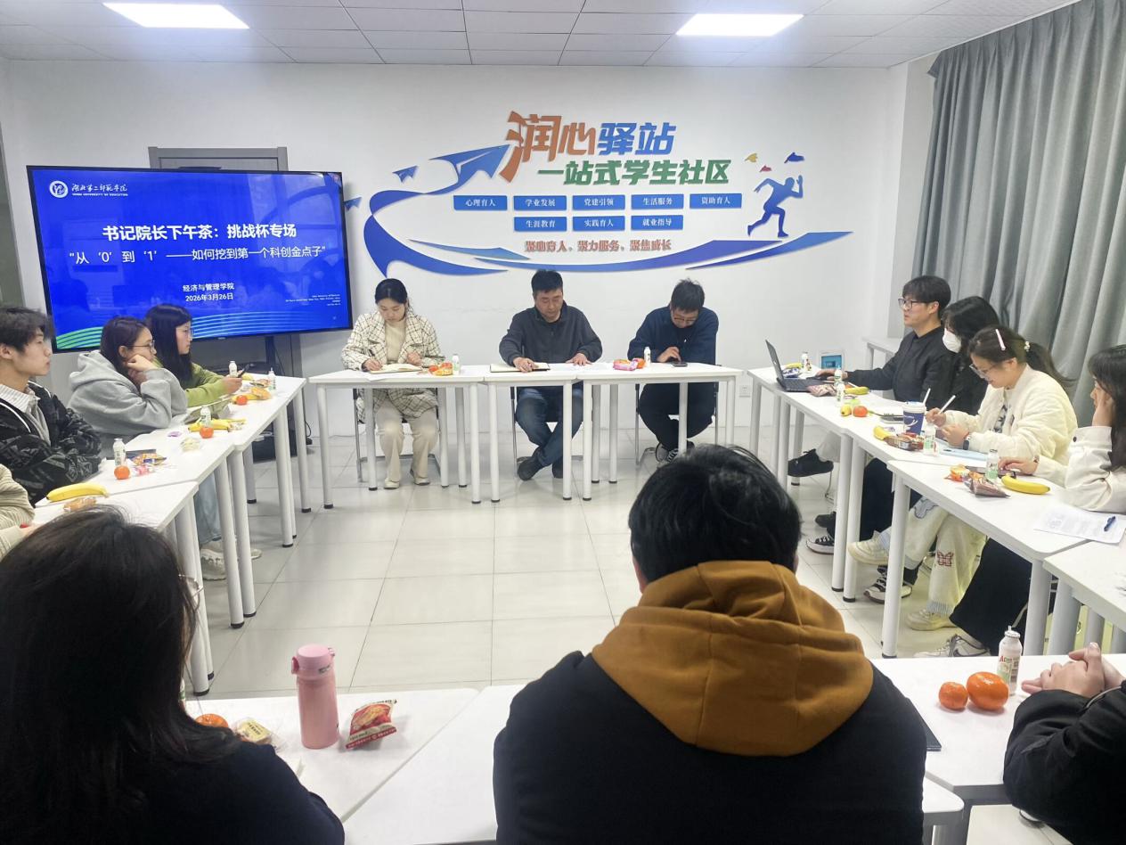 本网讯(通讯员 淡鑫)为深耕“一站式”学生社区育人阵地,推动育人力量下沉、拉近师生距离,3月26日中午,学院在“一站式”学生社区润心驿站,举办经管茶叙·“挑战杯”专场交流活动。学院党委副书记李京,学生会指导老师袁博翀,学生第四党支部书记叶莹,以及晋级校赛的“挑战杯”参赛学子齐聚一堂,围坐交流、共话科创。