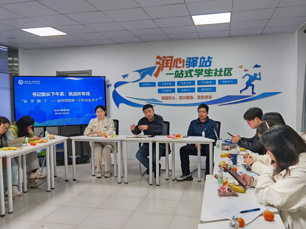 活动氛围轻松融洽,师生围坐倾心交谈。参赛学子依次分享各自项目的创业构想、核心思路、推进进度,以及筹备过程中遇到的瓶颈与困惑,畅谈从零起步探索科创之路的心得感悟。李京认真聆听每一个项目汇报,结合项目特色逐一精准点评、梳理思路,围绕项目选题打磨、核心亮点提炼、竞赛方案优化、路演展示提升等方面,给出针对性、可操作的指导建议,同时鼓励同学们敢于突破、勇于创新,坚定参赛信心、深耕项目细节。叶莹、袁博翀立足专业经验与同学们深入交流、答疑解惑,现场备好茶点饮品营造轻松氛围,同学们畅所欲言、互学互鉴,在思维碰撞中优化项目构思、明晰攻坚方向,营造出勤学善思、互助共进的良好氛围。